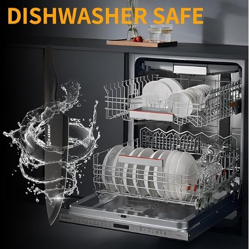 • QUALITY DESIGN – Our knife set with cutting board is crafted from high-quality German stainless steel, ensuring precision and accuracy. With a hardness of HRC 48-53, they offer exceptional sharpness and edge retention. The curved design handles provide comfort and support during use.