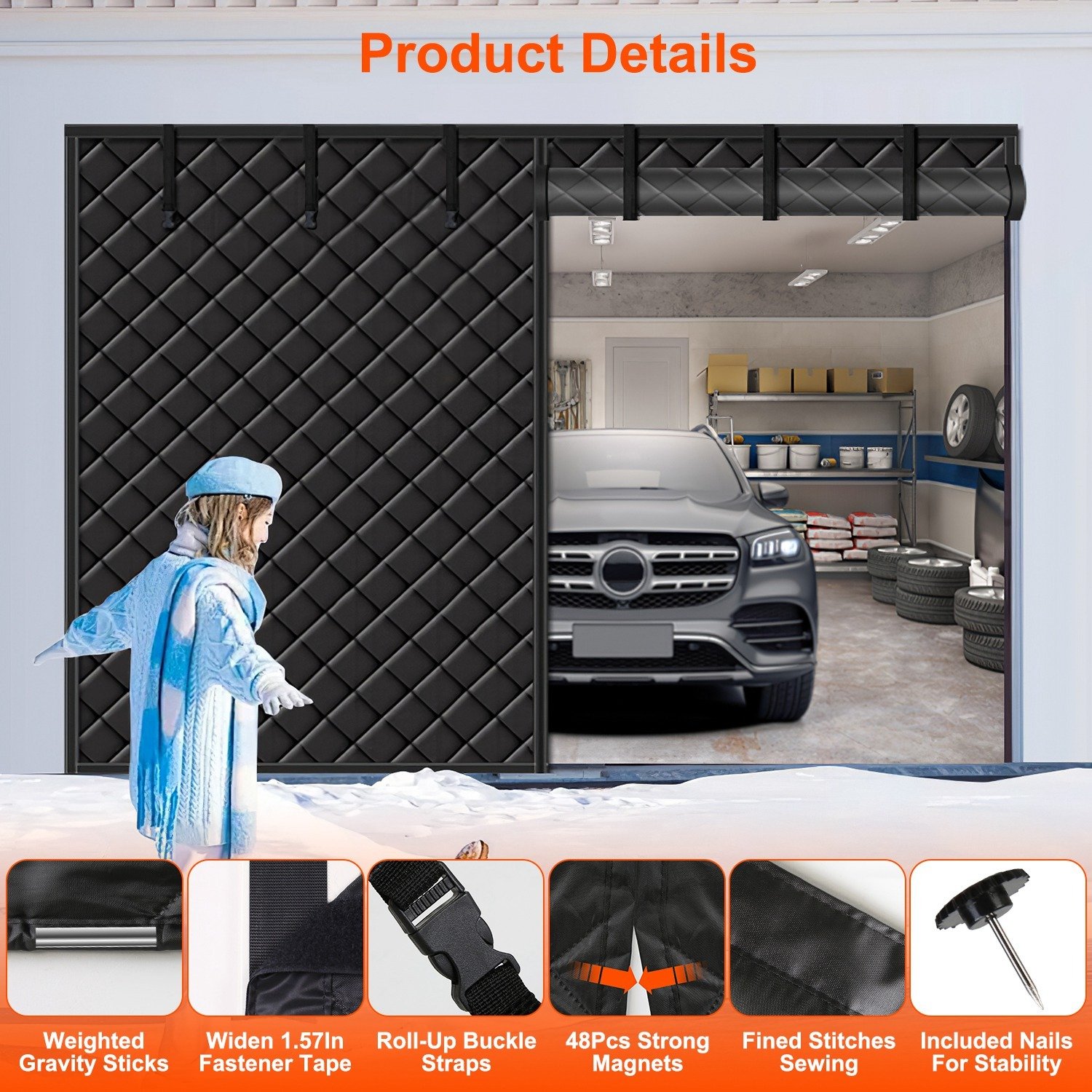 - *Thermal Insulated Garage Screen*: Constructed from 3-layer thermal insulated structure(oxford cloth-silk wadding fillings-oxford cloth),our garage door screen ensures better sealing performance to prevent cold air from infiltrating,which plays a crucial role in maintaining a stable and warm indoor temperature during the winter months. Enjoy peaceful,warm and cozy moments while winter winds howl outside.