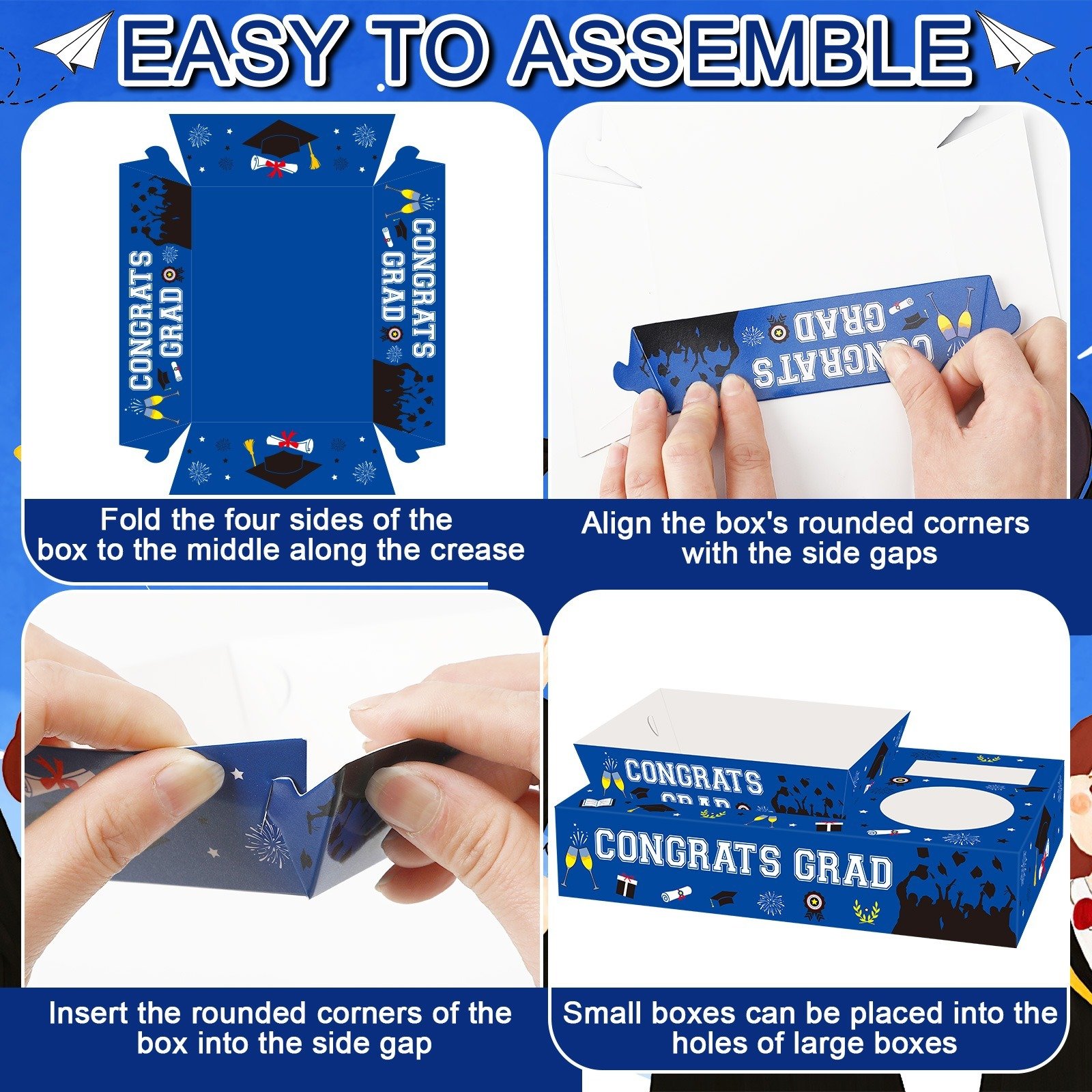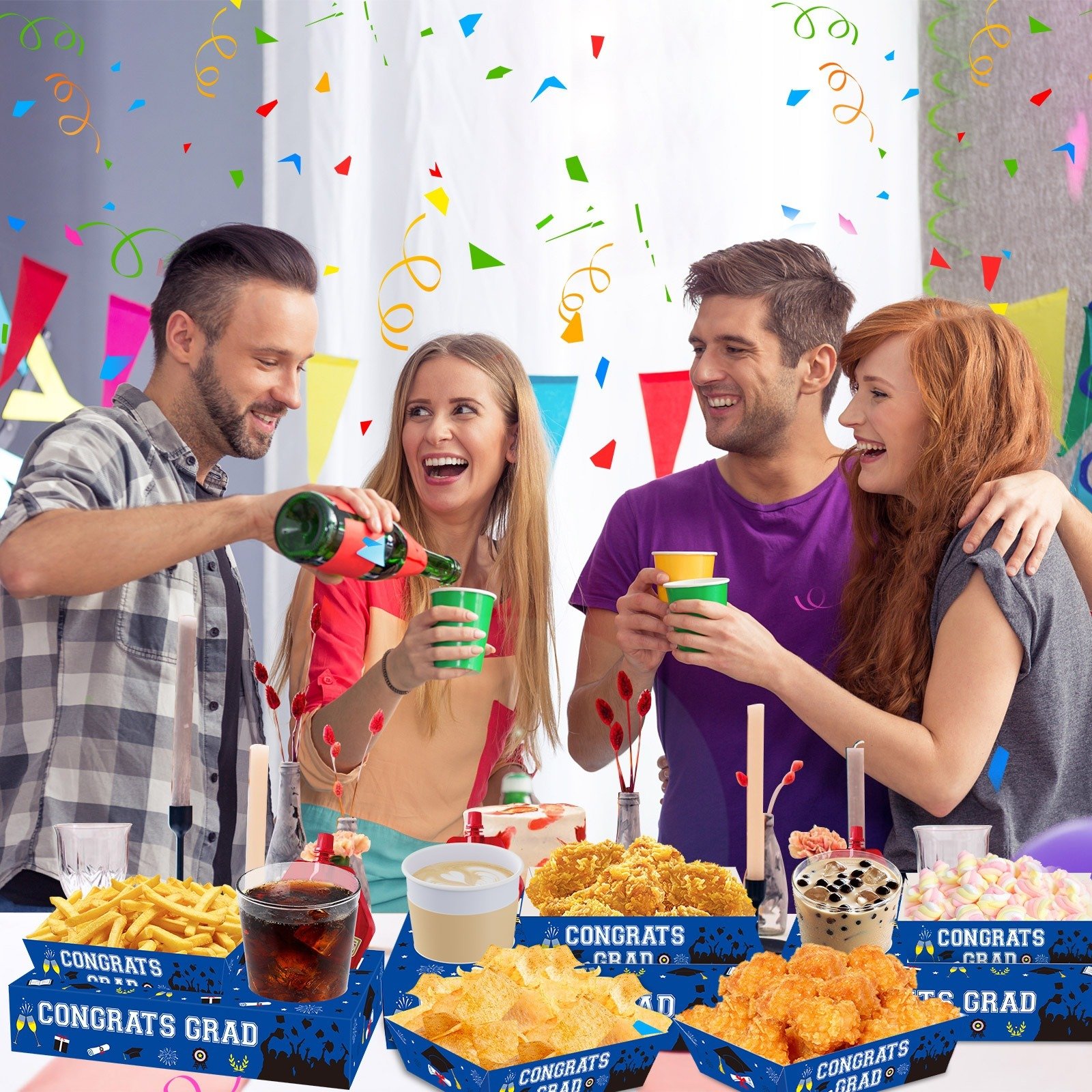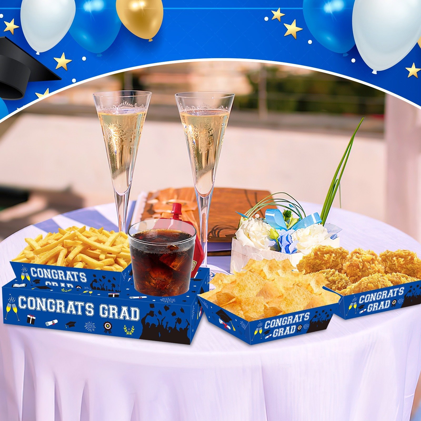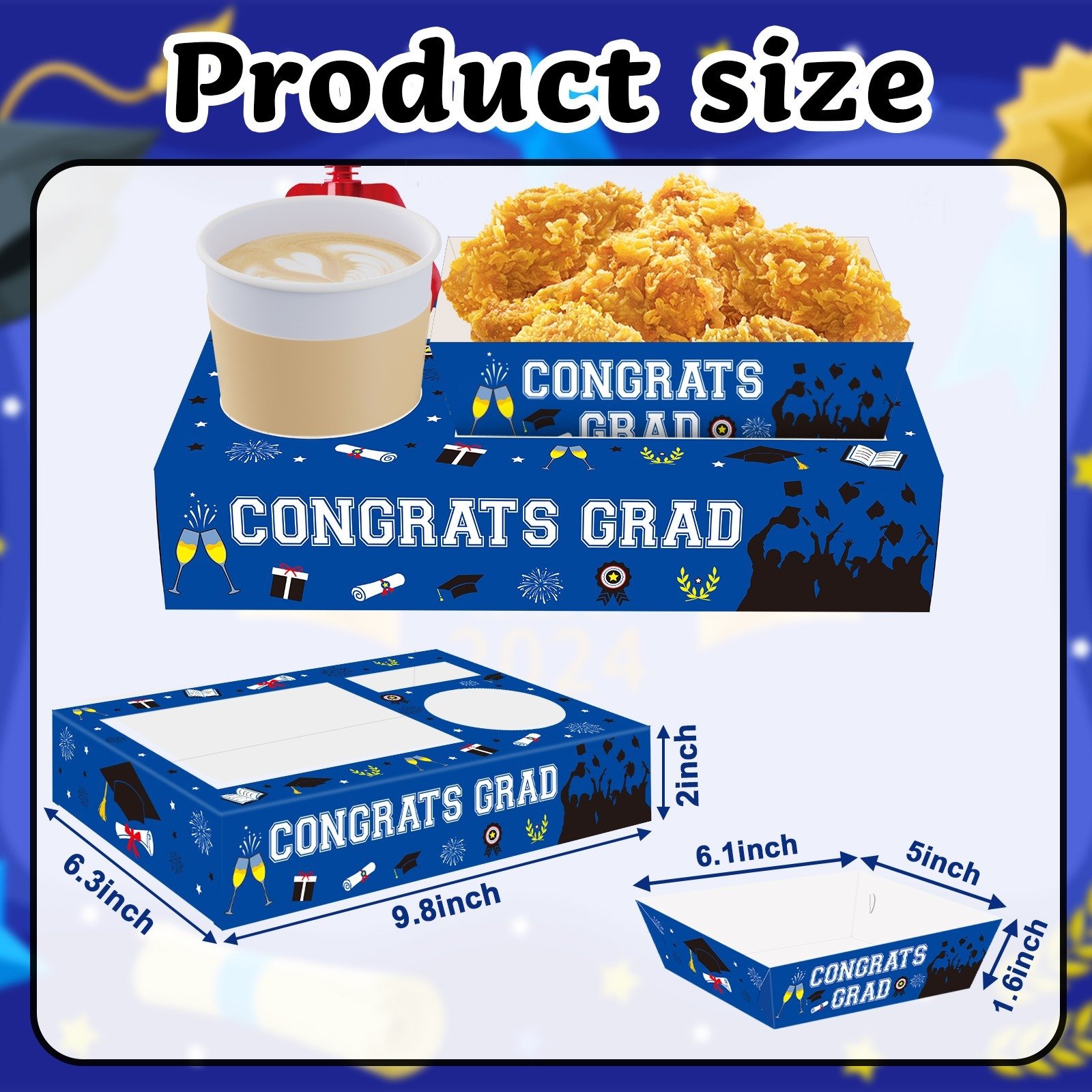 The 36 pieces graduation tray decor set is an ideal choice for graduation celebrations! The graduation dessert plates set contains 18 pieces graduation snack boxes and 18 pieces graduation food trays, which can meet the needs of various foods. Each graduation paper tray and snack box is printed with classic elements of graduation, such as graduation caps and scrolls, which are brightly colored and beautifully designed, and can add a warm and joyful atmosphere to your graduation party.