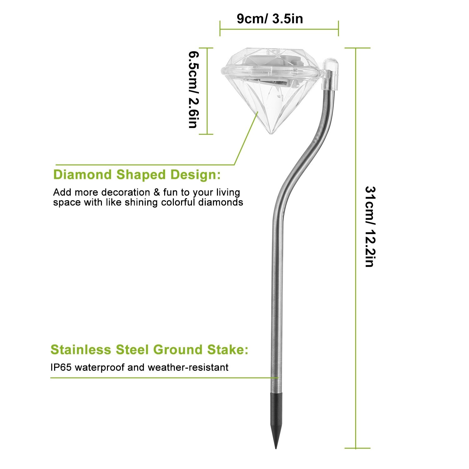 - **IP65 WATERPROOF & WEATHER-RESISTANT*: The diamond solar garden lights are designed with high-quality stainless steel poles,premium ABS plastic,which feature IP65 waterproof and work great in heatproof,weather-resistant and are able to survive heat,rain,cold and frost.