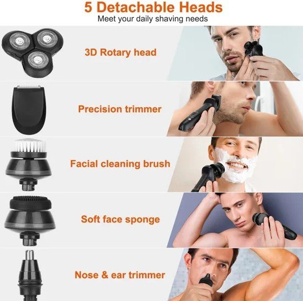 Professional Shaver: This 5 in 1 grooming kit contains 3D rotary shaver, nose hair trimmer, facial cleaning brush, precision trimmer, soft face sponge, and one charging base.Powerful enough to satisfy your facial shaving needs.