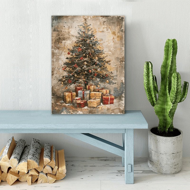 A Canvas Oil Painting With A Wooden Frame, Depicting A Vintage Christmas Tree With Gifts Under It Decorating The Living Room.