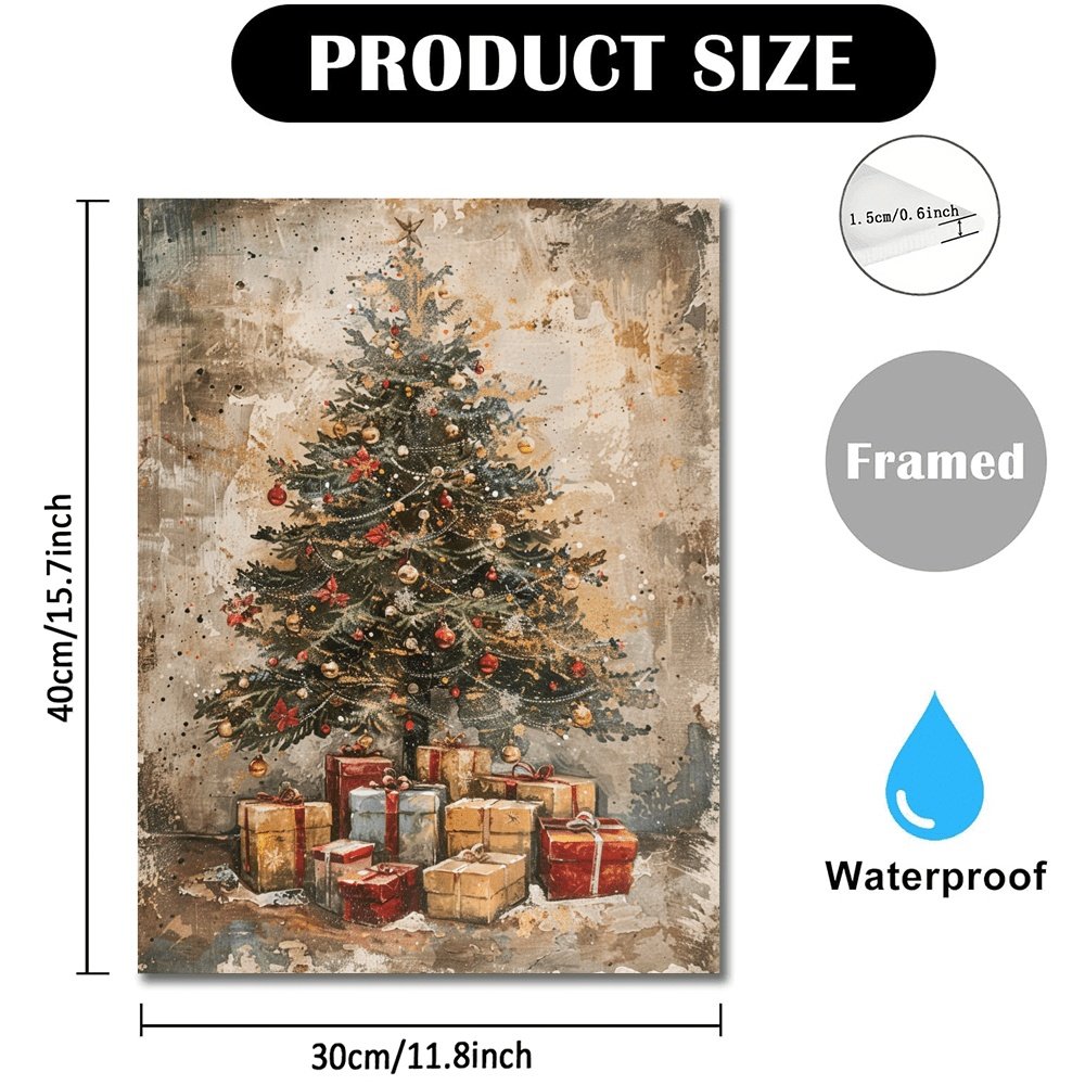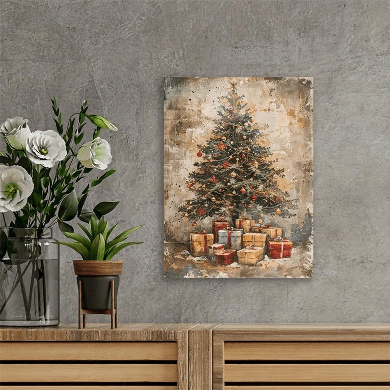 Be the first to review “A Canvas Oil Painting With A Wooden Frame, Depicting A Vintage Christmas Tree With Gifts Under It Decorating The Living Room.”