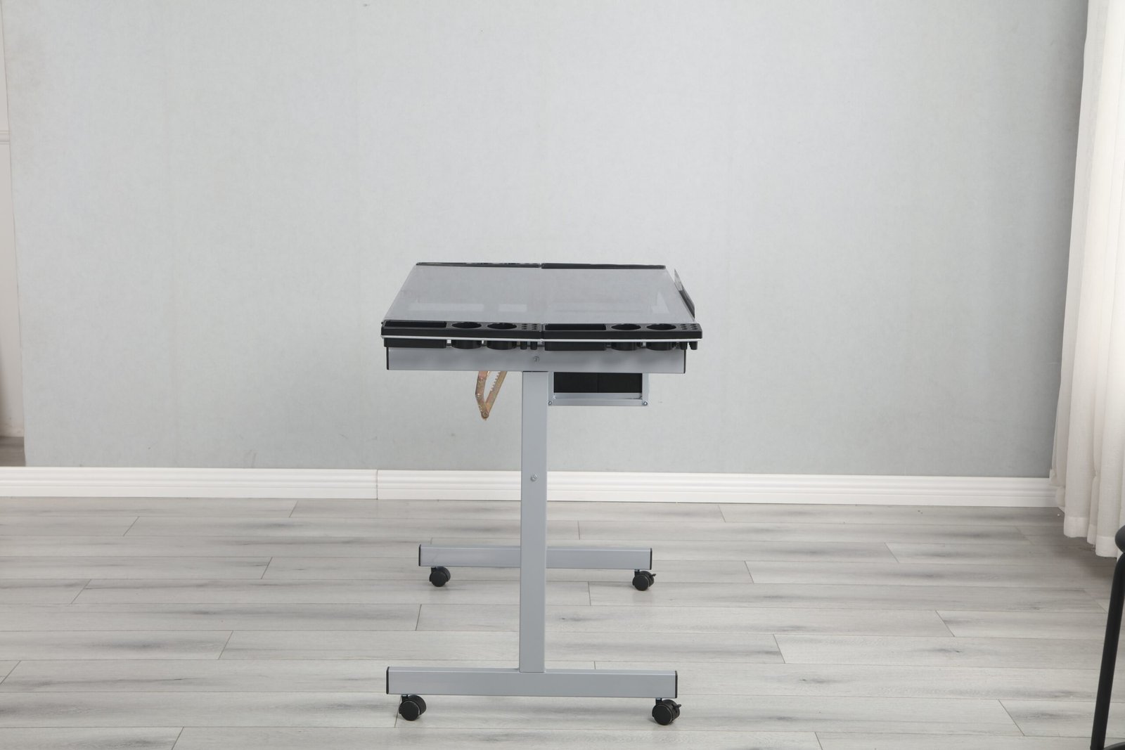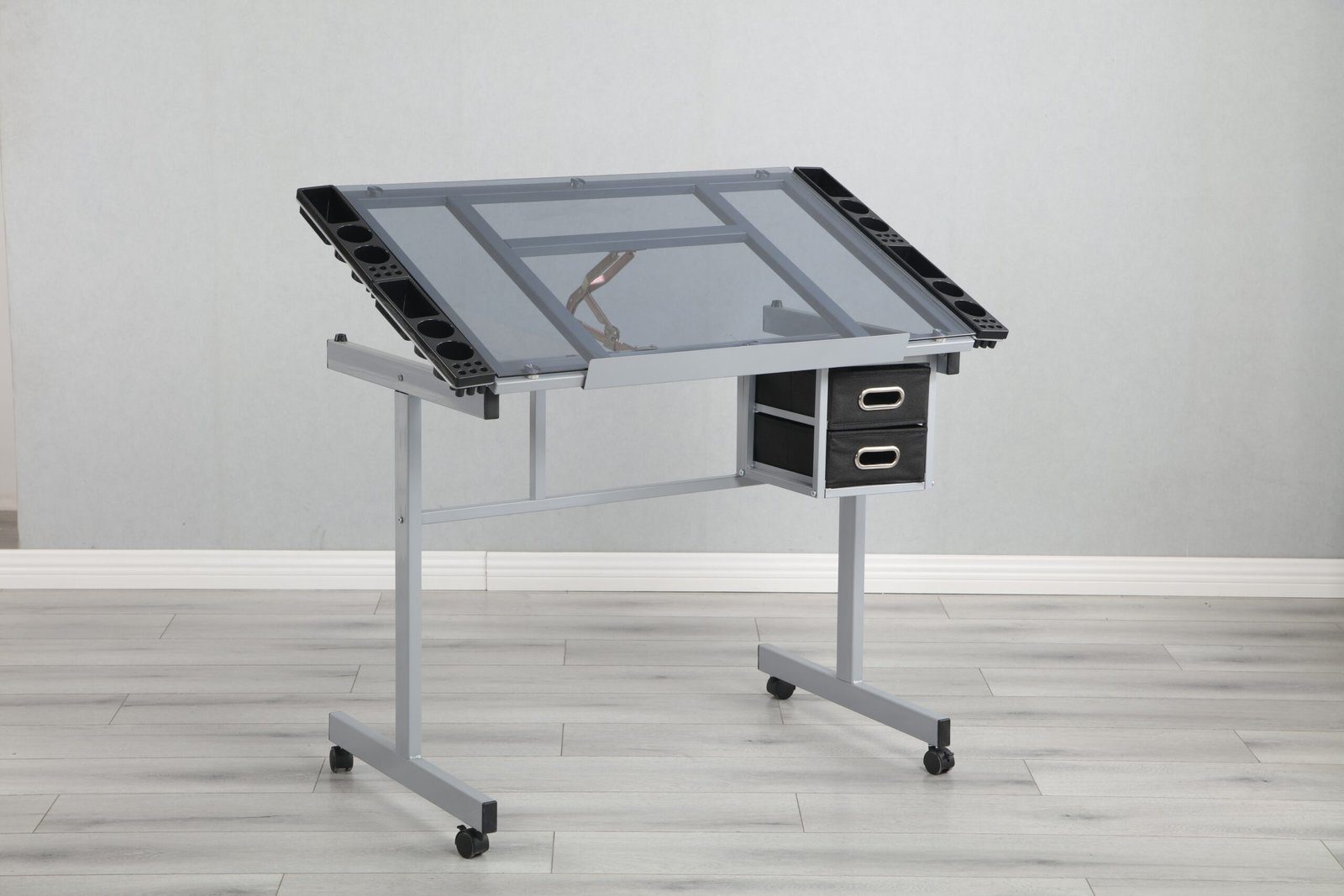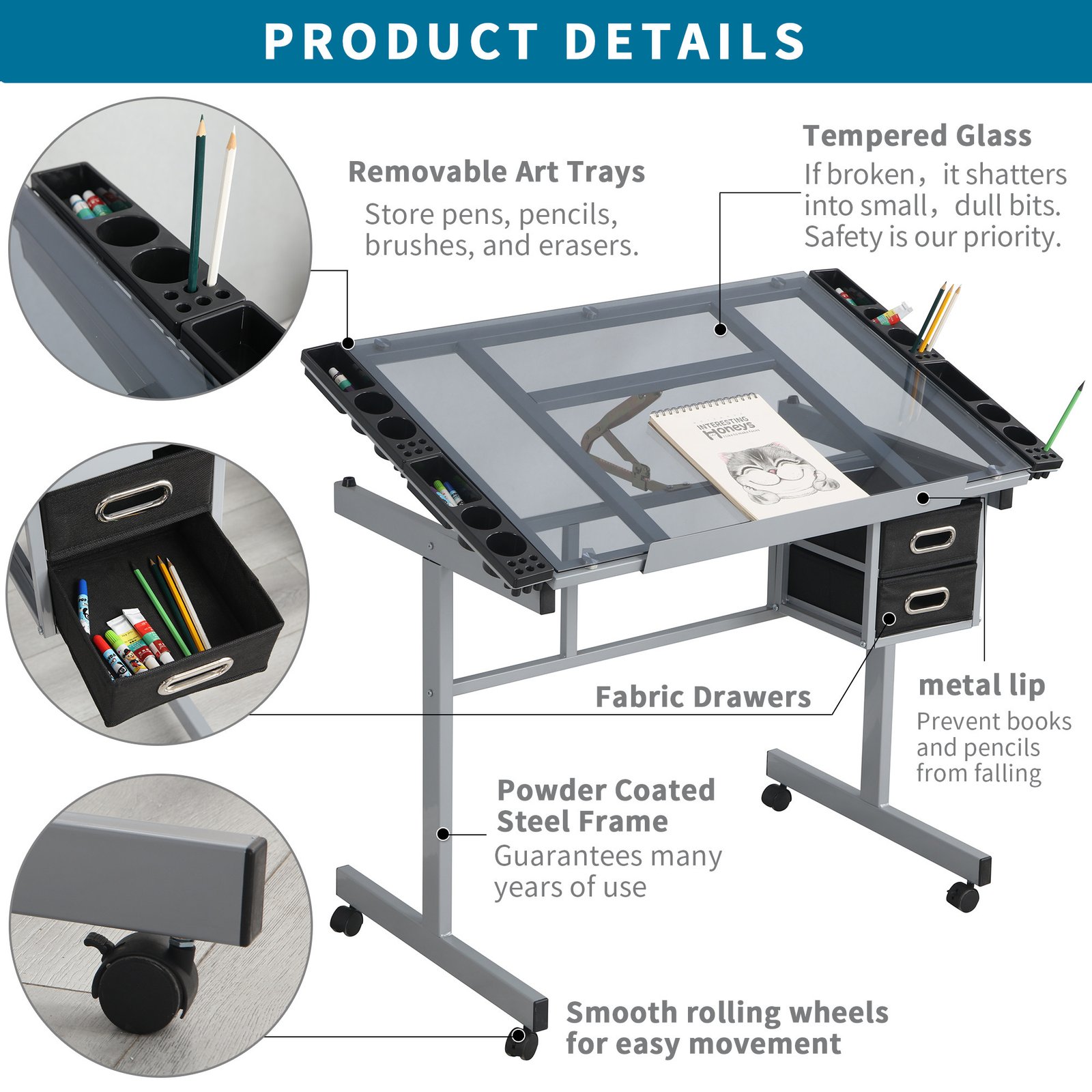 - Storage space:This glass top drafting table desk features a host of compartments, trays and hanging drawers underneath for holding all of your paints, pens, and other equipment. If you accidentally spill ink and paint on the table, glass table top is easy to clean.