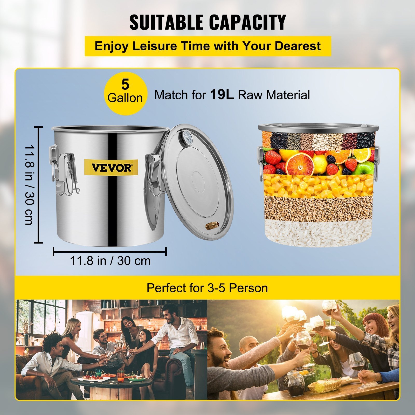 Sufficient Capacity: This alcohol still provides you with a fermentation capacity of 5 gallons. Boiler barrel: 11. 8″ x 11. 8″ (30 x 30 cm), condenser: 7.9″ x 4.3″ (20 x 11 cm), which can ferment up to 19 liters of raw materials. Perfect for family-together parties. All parts are made of food-grade materials, including silicone, stainless steel, and copper.