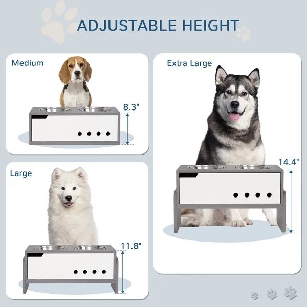 • – Adjustable for Growth: This dog bowl stand adjusts to three heights (8.3″, 11.8″, 14.4″), accommodating your growing pet from medium to extra-large sizes.
