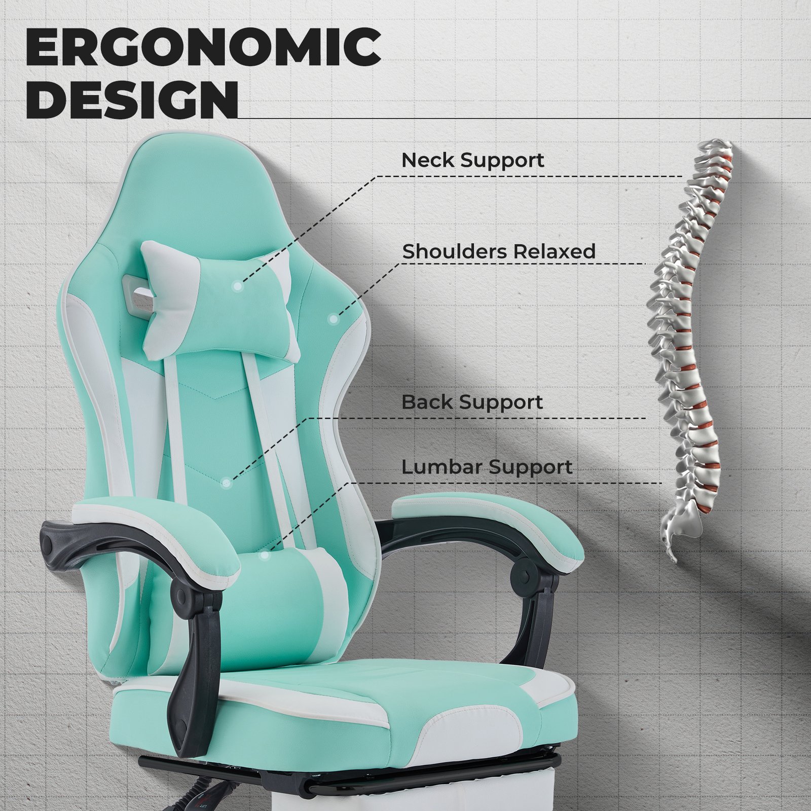 - Ergonomic Design: The ergonomic design of the gaming chair, with the back naturally aligned with the human spine, provides all-around support from the neck to the waist. Headrest and lumbar support help distribute stress, maintain natural curvature in the cervical and lumbar spine, and relieve discomfort from sitting for long periods. Scientific support structure, helps users maintain the correct sitting position, reduce the body burden, and improve comfort