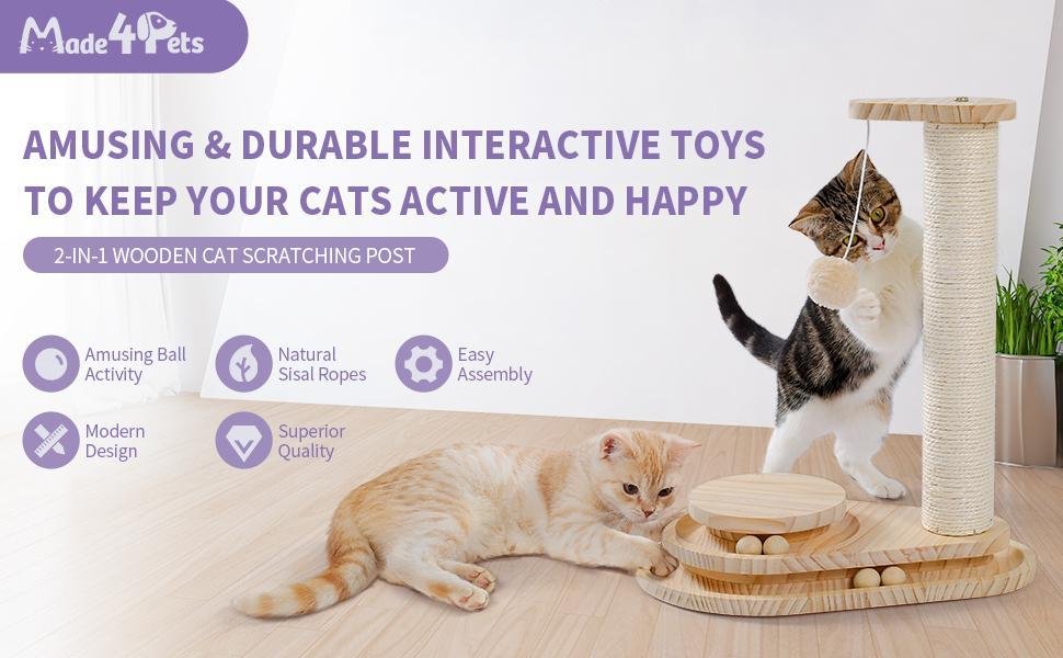 Sturdy Construction & Compact Design: Built from solid wood, the cat scratching posts are odor-free and easy to clean; take only a small space and move easily throughout the house; provide your feline with a heavier, sturdier, and more convenient toy