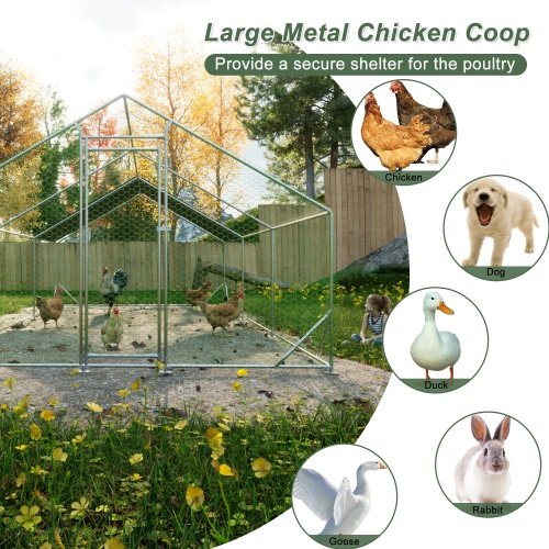 Our chicken run manufactured with high quality steel frame, including ground nails, so that the fence can better fixed to the ground.solid enough to keep the poultry from escaping and secure from predators. And this hen run house is also stably stationed to withstand the wind and snow weather. Featuring a durable sun and rain-proof tarp on the top, it is protective for the steel frame, wire mesh and animals under its cover. And the tarp is sturdy enough to avoid tear up or fade over time. With hexagonal wire mesh and the small gaps between meshes, you can prevent your chicken from some predators to make them safety. The spring clasp design requires no-welding for your quick assembly with this large metal chicken run. You can easily understand the installation with a complete set of components and simple instructions we offered. Lockable chicken run house suitable for a variety of animals like for chickens, rabbits, ducks and more.This walk-in metal poultry house has a spacious area for the animal to play and rest in the backyard garden and farm settings.