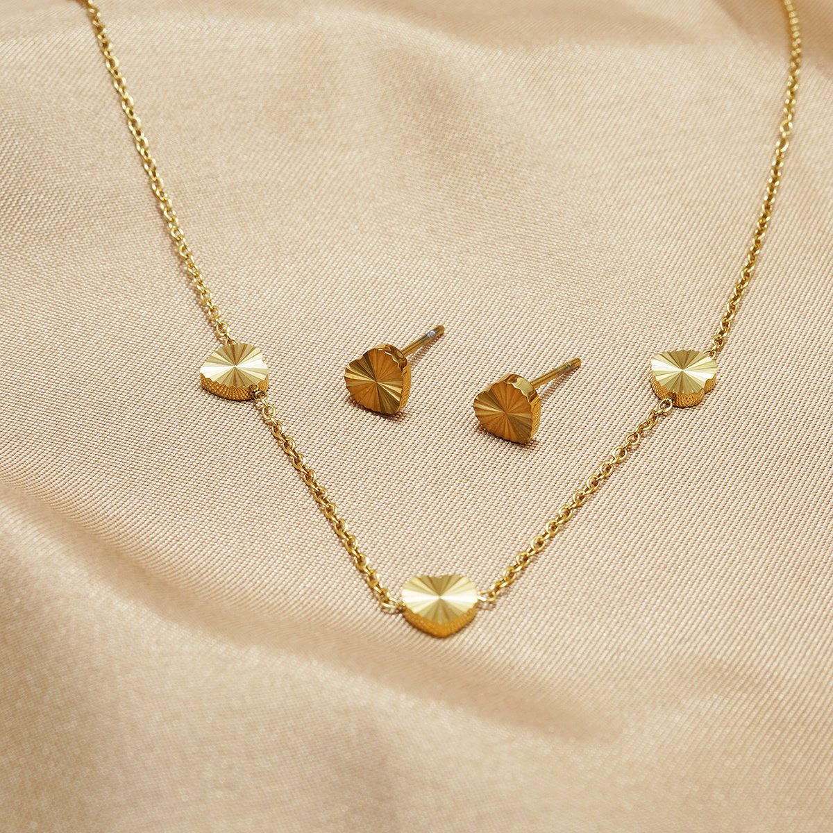 Add a modern twist to your look with this geometric heart-shaped jewelry set. The brushed gold surface catches the light beautifully, offering a minimalist yet luxurious aesthetic.
