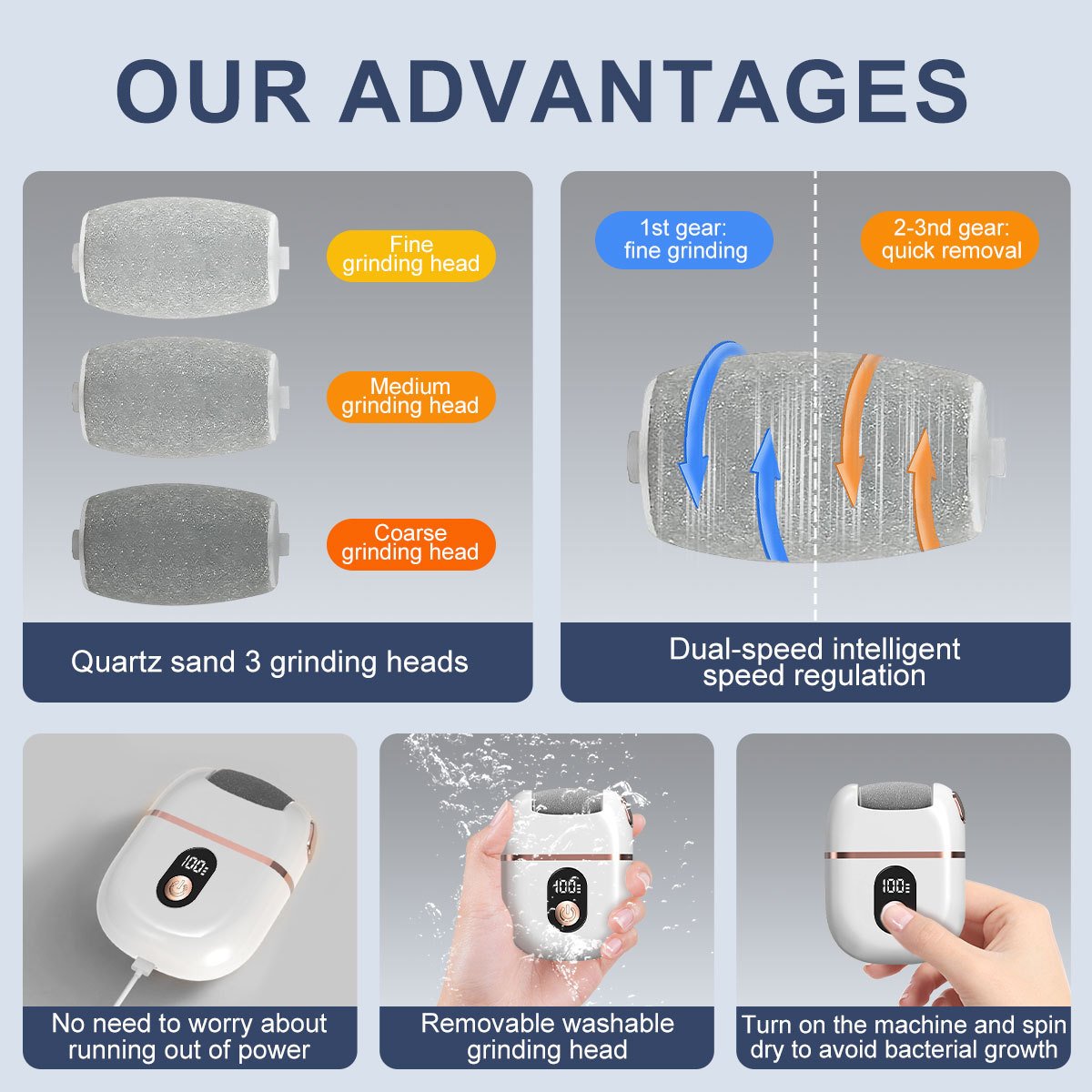 • 【Powerful Use Life】The foot grinder is rechargeable. It comes with USB and fast charging ports, requiring approximately 4 hours of charging time and providing up to 6 hours of continuous operation.