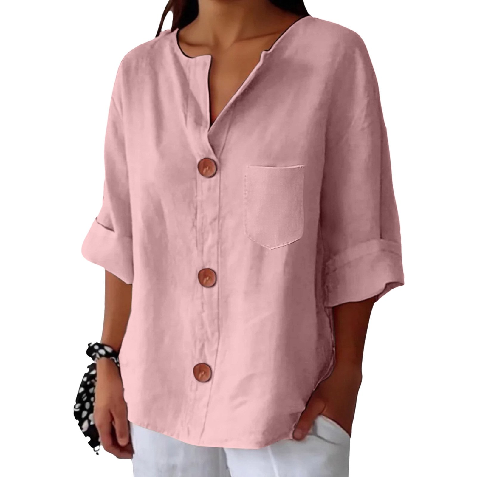 New Style Loose T-shirt For Women With V-neck, Made Of Cotton And Linen, Buttoned Top.