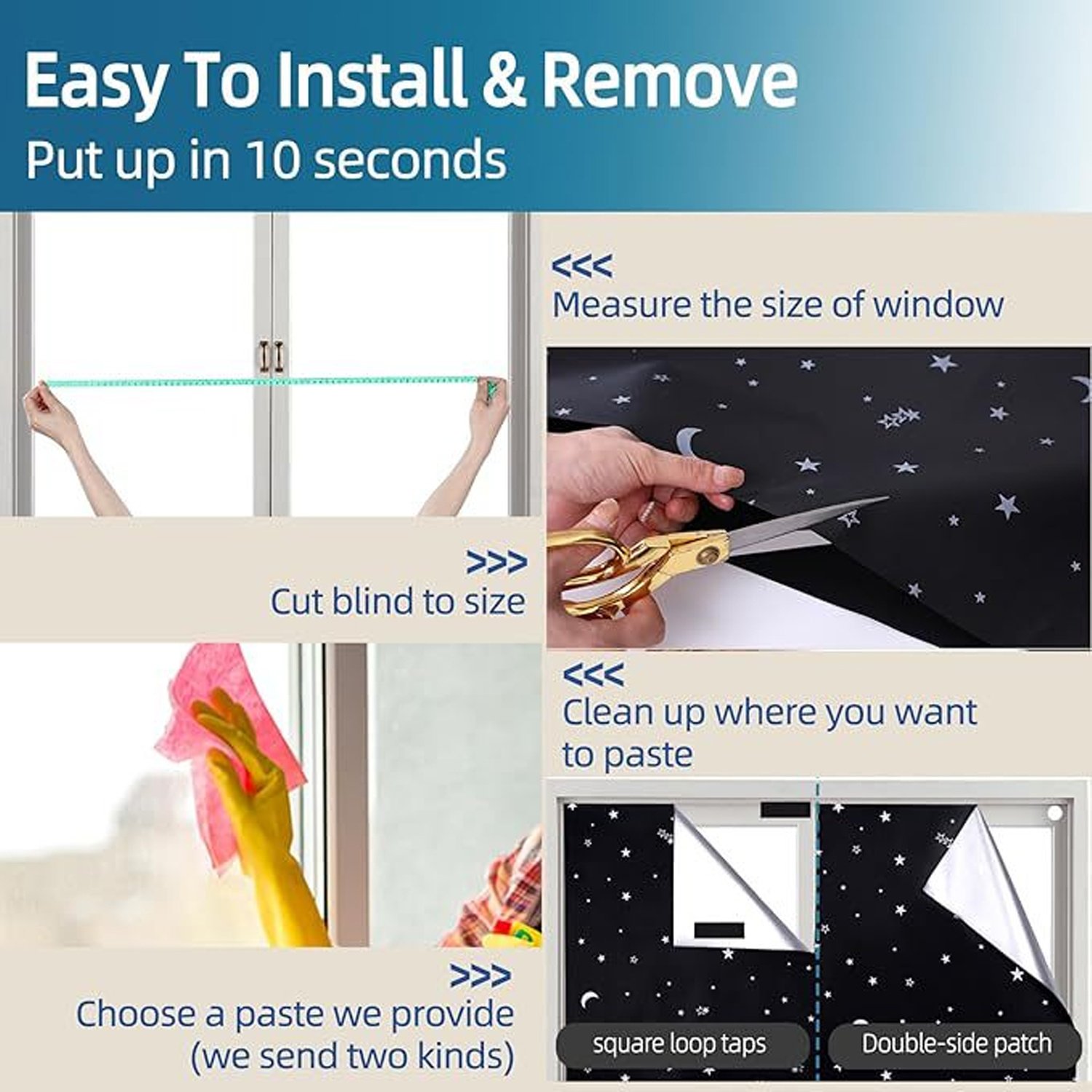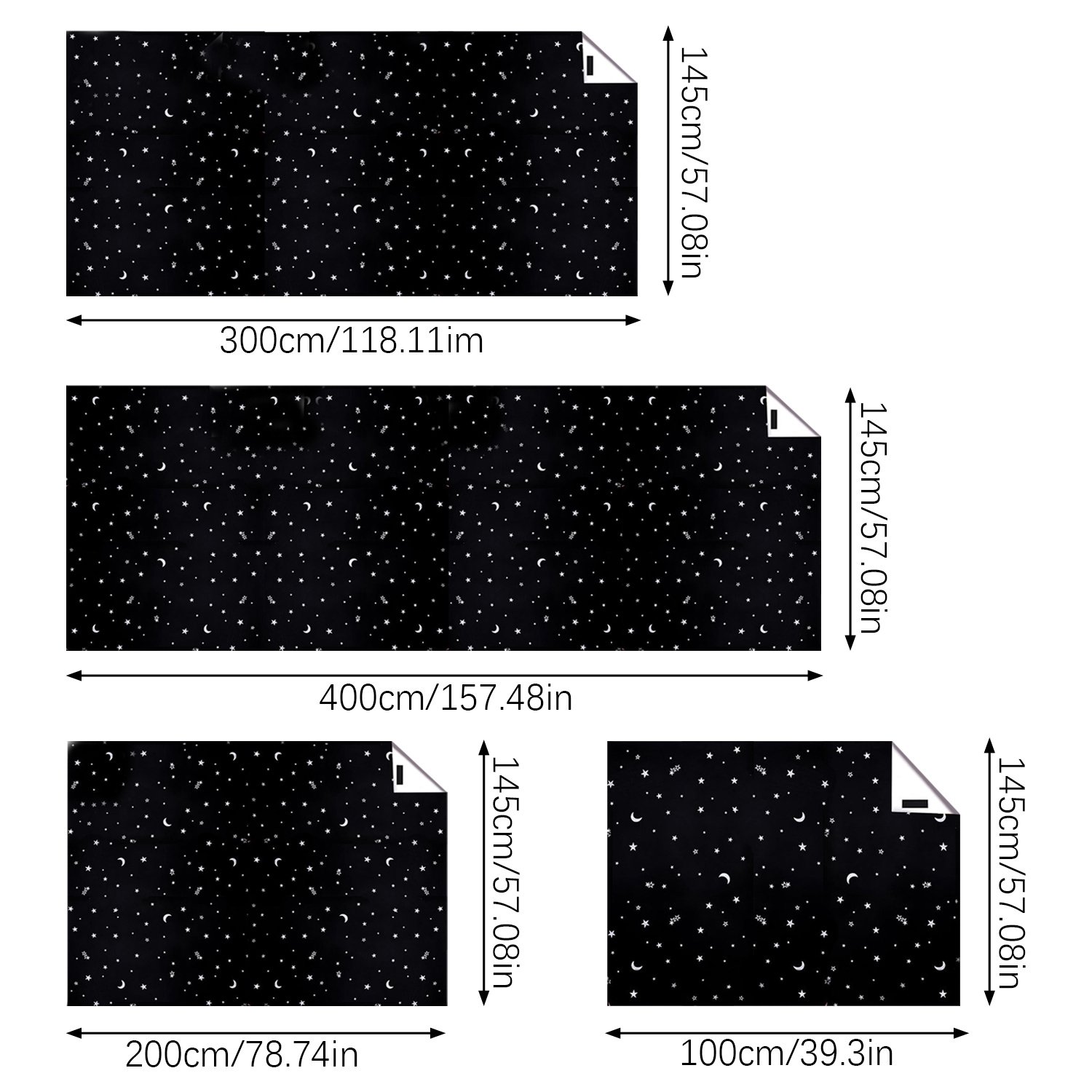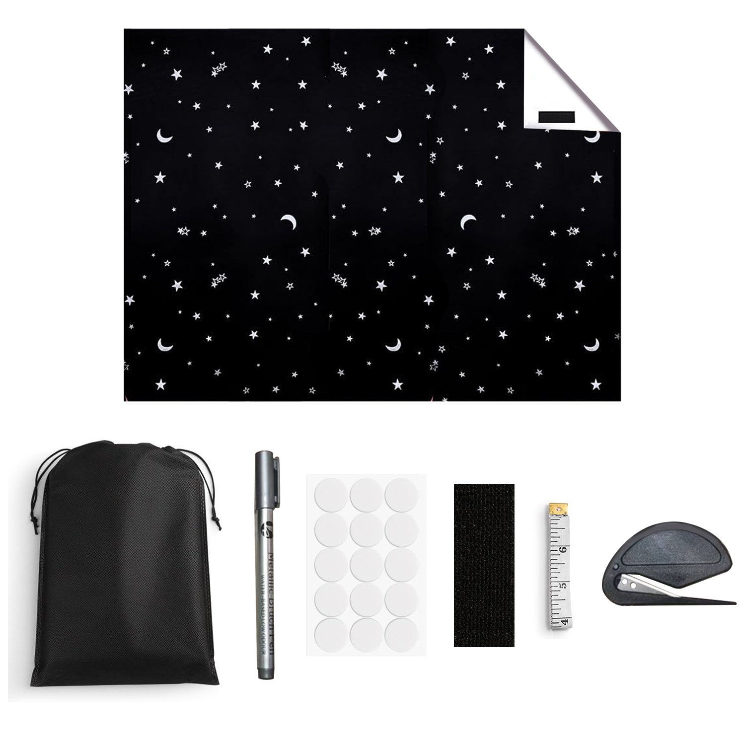 Package Contents: 100{f8951bb040699499d8a073318de34772c095ae6a6ba1b016f899a2e28d781563} Blackout Star Moon Curtains Set for Bedroom with Bag Loop Tape Strips Knife Ruler Pen