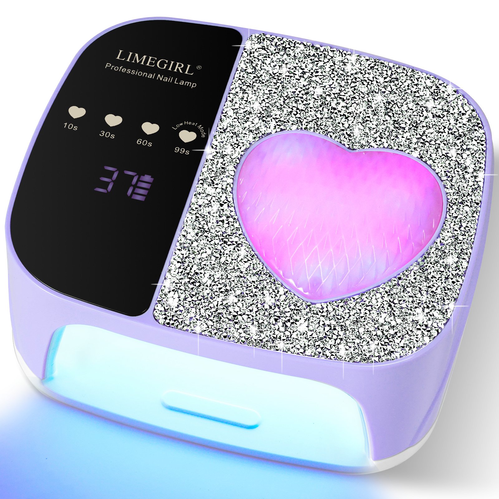 - Rhinestone and Heart Ambient Light: LimeGirl rhinestone gel nail UV light lamp comes with delicate design,and the heart light provide a sense of atmosphere as well as a reminder of the power situation,the gel nail uv light lamp features a rhinestone cover and durable materials,presenting a sparkling diamond effect,which look more attractive and use comfortably.