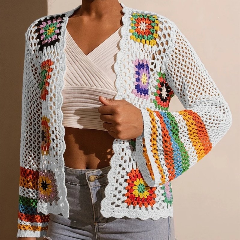 Elevate your spring and summer wardrobe with this beautifully crafted crochet cardigan. Featuring an elegant open-front design with vibrant color blocking, this lightweight cover-up adds instant boho charm to any outfit while providing just the right amount of coverage.