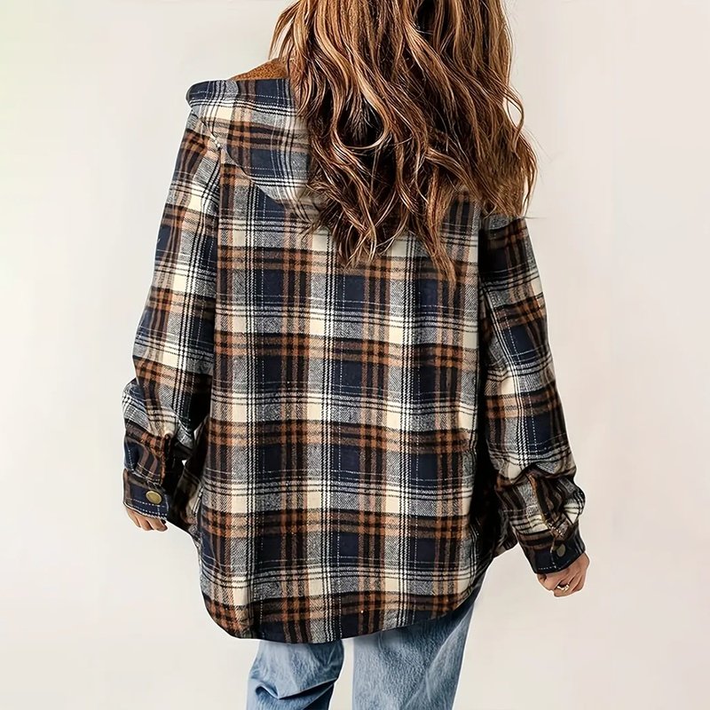 Stay cozy and stylish in our Plaid Hooded Fleece-Lined Jacket! .