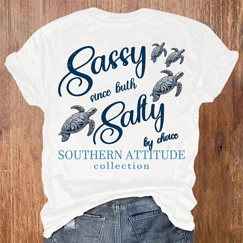 Women’s Round Neck Turtle & Slogan Graphic Tee – Playful Summer Essential
