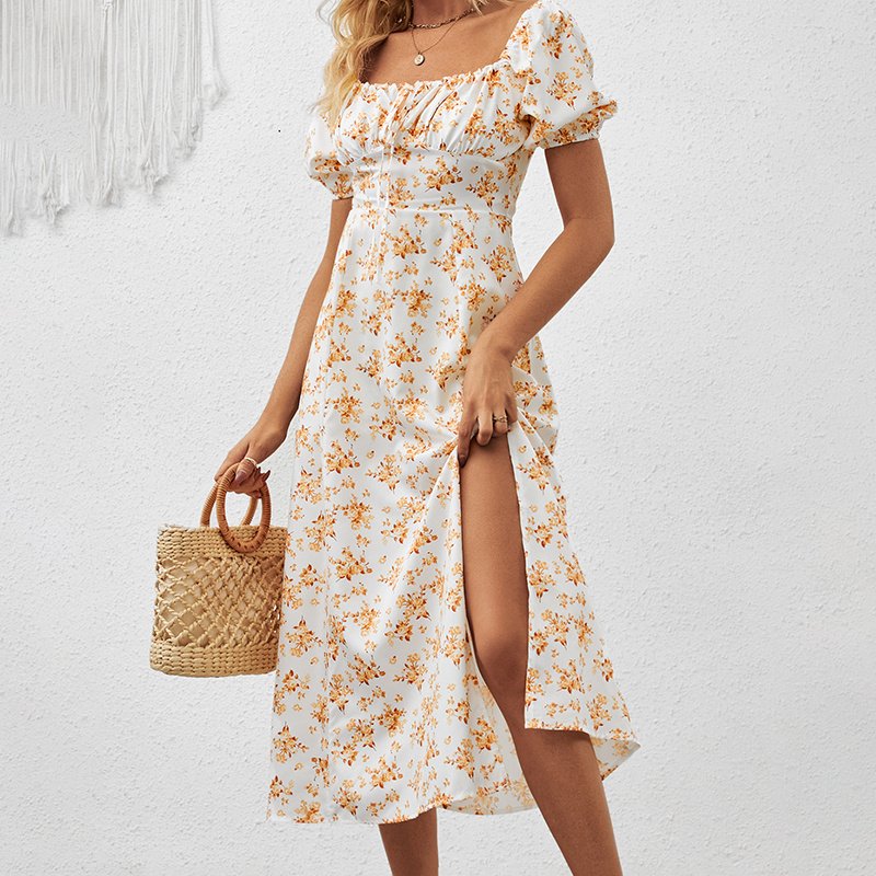 Women’s Square Neck Floral Print Boho Dress with Puff Sleeves & Side Slit